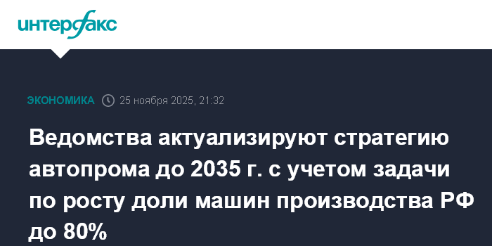 Москва. 25 ноября. INTERFAX.RU - Актуализированная стратегии развития автомобильной промышленности РФ до 2035 года предполагает стимулирование объемов реализации, повышение технической оснащенности автомобилей и рост доли отечественной продукции на рынке до 80%.
