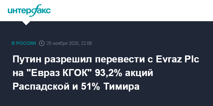 Путин разрешил перевести c Evraz Plc на "Евраз КГОК" 93,2% акций Распадской и 51% Тимира