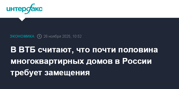 Москва. 26 ноября. INTERFAX.RU - В России около 1,2 млрд кв.м многоквартирного жилья устарело и требует замещения, заявил на конференции "Девелоперы и банки: диалог 2025/2026" руководитель дирекции кредитования недвижимости банка ВТБ Сергей Падалка.
