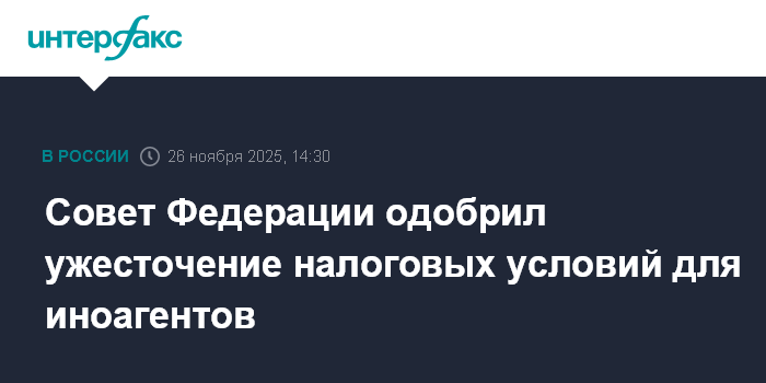 Москва. 26 ноября. INTERFAX.RU - Совет Федерации одобрил поправки к Налоговому кодексу, которые вводят для иностранных агентов единую ставку налога на доходы физических лиц (НДФЛ) в размере 30%.