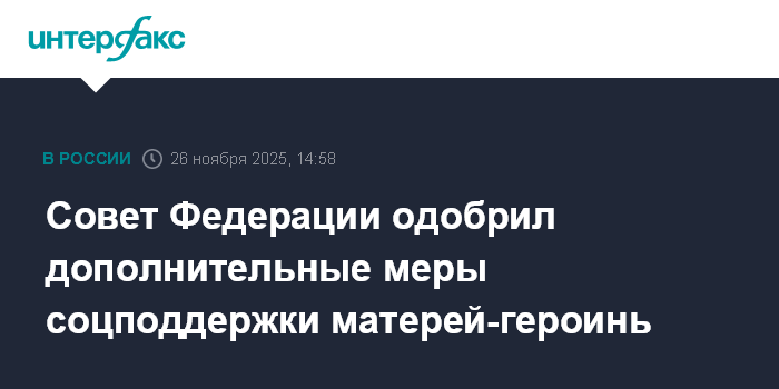 Москва. 26 ноября. INTERFAX.RU - Совет Федерации одобрил два закона о социальных гарантиях женщинам, удостоенным звания "Мать-героиня".