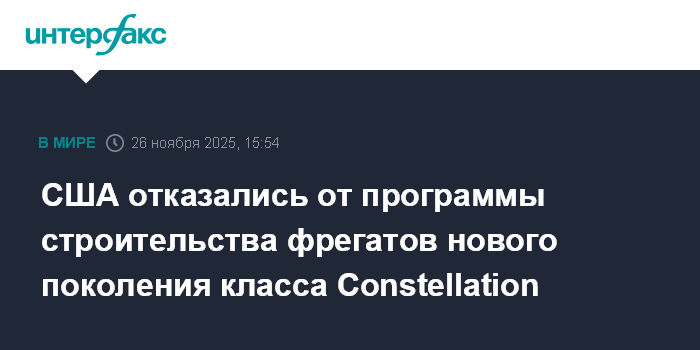 Москва. 26 ноября. INTERFAX.RU - ВМС США отменили программу строительства серии фрегатов класса Constellation нового поколения и рассматривают возможность создания взамен малых надводных боевых кораблей, сообщил в соцсети министр американских военно-морских сил Джон Фелан.