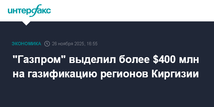 Москва. 26 ноября. INTERFAX.RU - Российский концерн "Газпром" выделил более $400 млн на программу газификации киргизских регионов, что позволило повысить уровень обеспечения газом в стране до 42%, сообщило российское Минэнерго.