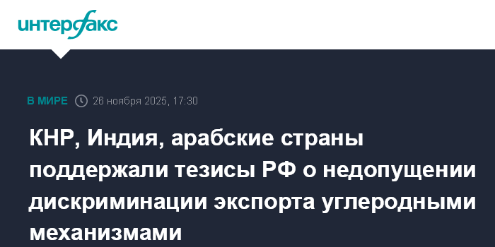 Москва. 26 ноября. INTERFAX.RU - Россия в ходе Климатического саммита ООН в Бразилии (COP30) заручилась поддержкой Китая, Индии и арабских стран по вопросу пограничного корректирующего углеродного механизма (ПКУМ, CBAM) Евросоюза, сообщил в интервью "Интерфаксу" заместитель министра экономического развития РФ Владимир Ильичев.