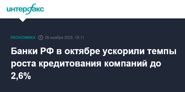 Москва. 26 ноября. INTERFAX.RU - Российские банки в октябре ускорили темпы роста кредитования компаний до 2,6% с 0,6% месяцем ранее, свидетельствуют данные в обзоре ЦБ о развитии банковского сектора.