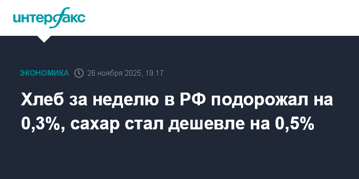 Хлеб за неделю в РФ подорожал на 0,3%, сахар стал дешевле на 0,5%
