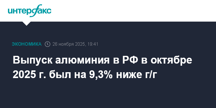 Выпуск алюминия в РФ в октябре 2025 г. был на 9,3% ниже г/г