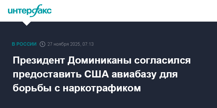 Москва. 27 ноября. INTERFAX.RU - Президент Доминиканской республики Луис Абинадер заявил, что разрешил США использовать авиабазу и аэропорт Доминиканской Республики для проводимой Вашингтоном кампании против наркокартелей, сообщил Bloomberg.