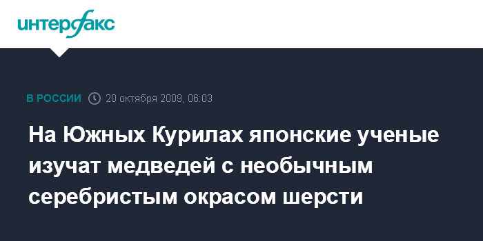 Южно-Сахалинск. 20 октября. ИНТЕРФАКС - ДАЛЬНИЙ ВОСТОК - Японские ученые совместно с сотрудниками заповедника "Курильский" проведут совместную экспедицию по изучению бурых медведей на о. Кунашир, имеющих необычный серебристый окрас шерсти.