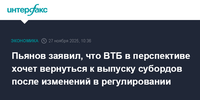 Москва. 27 ноября. INTERFAX.RU - ВТБ в перспективе хочет вернуться к выпуску субордов после изменений в регулировании, но это не вопрос 2026 года, заявил в интервью "Интерфаксу" первый зампред банка Дмитрий Пьянов в преддверии форума "Россия зовет!".