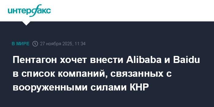 Москва. 27 ноября. INTERFAX.RU - Пентагон посчитал, что китайские Alibaba Group Holding Inc., Baidu Inc. и BYD Co. оказывают поддержку вооруженным силам КНР и должны быть включены в США в соответствующий список (1260H), сообщает Bloomberg.