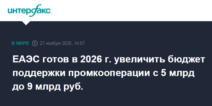 Москва. 27 ноября. INTERFAX.RU - Объем средств, предусмотренных в бюджете Евразийского экономического союза (ЕАЭС) на поддержку проектов кооперации в промышленности и АПК, в 2026 году составит 9 млрд рублей, что в 1,8 раза больше суммы, заложенной на текущий год.