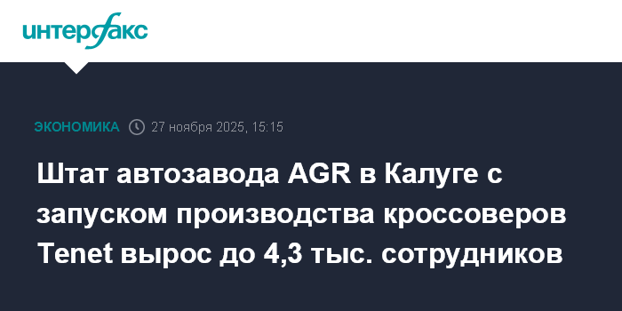Москва. 27 ноября. INTERFAX.RU - Численность сотрудников калужского автозавода группы AGR (бывшая площадка Volkswagen) сейчас составляет около 4,3 тыс. человек, после перезапуска с локализацией кроссоверов Tenet на предприятие возвращаются ранее уходившие сотрудники, сообщил гендиректор группы AGR Андрей Карагин журналистам.