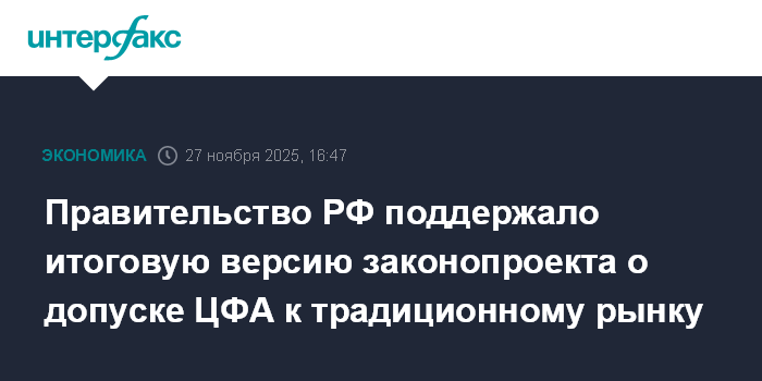 Москва. 27 ноября. INTERFAX.RU - Правительство РФ поддержало итоговую редакцию депутатского законопроекта о допуске цифровых финансовых активов (ЦФА) к традиционной инфраструктуре рынка ценных бумаг и распространении на них действующих правил брокерской и доверительной деятельности.