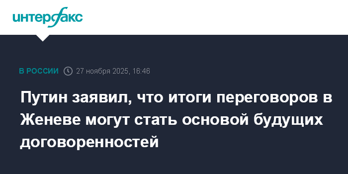 Москва. 27 ноября. INTERFAX.RU - Результаты переговоров между Украиной и США в Женеве могут быть положены в основу будущих мирных договоренностей, считает президент РФ Владимир Путин.