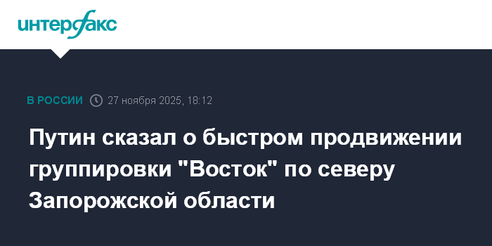 Москва. 27 ноября. INTERFAX.RU - Группировка ВС РФ "Восток" сломила оборону ВСУ и движется быстрыми темпами по северу Запорожской области, военные уже подошли к важному логистическому пункту - городу Гуляйполе в Пологовском районе, сообщил президент РФ Владимир Путин.