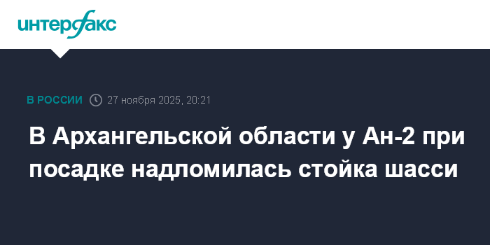 "По предварительным данным, в 15:55 четверга при посадке на аэродром "Васьково" у самолета АО "2-й Архангельский объединенный авиаотряд", рейс Лешуконское - Архангельск, частично надломилась левая стойка шасси", - отмечает ведомство.