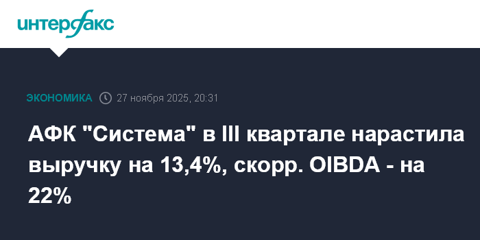 Москва. 27 ноября. INTERFAX.RU - Выручка ПАО АФК "Система" в III квартале 2025 года составила 355,3 млрд рублей, что на 13,4% больше, чем годом ранее, сообщила корпорация.