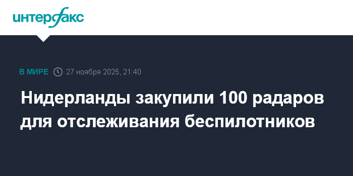 Москва. 27 ноября. INTERFAX.RU - Нидерланды приобрели 100 радиолокаторов с целью заблаговременно отслеживать появление беспилотников, сообщают западные СМИ со ссылкой на нидерландское Минобороны.