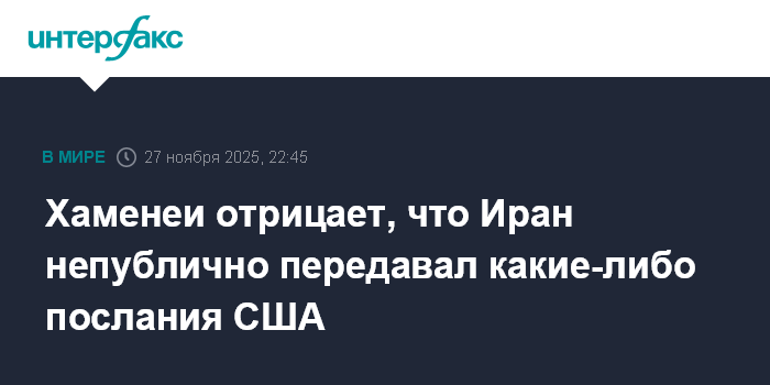 Москва. 27 ноября. INTERFAX.RU - Верховный лидер Ирана аятолла Али Хаменеи заявил, что Тегеран не передавал никаких сообщений Вашингтону через третью сторону.