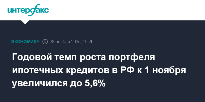 Москва. 28 ноября. INTERFAX.RU - Годовой темп роста портфеля ипотечных жилищных кредитов (ИЖК) российских банков по состоянию на 1 ноября 2025 года увеличился до 5,6% после 4,9% на 1 октября и 3,6% на 1 сентября, сообщается в обзоре рынка ипотечного жилищного кредитования, опубликованном на сайте ЦБ РФ.