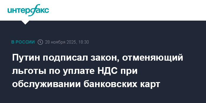 Путин подписал закон, отменяющий льготы по уплате НДС при обслуживании банковских карт