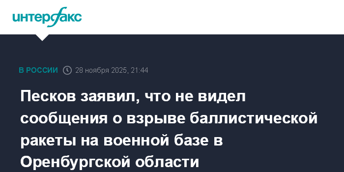 Москва. 28 ноября. INTERFAX.RU - Пресс-секретарь президента РФ Дмитрий Песков заявил, что не видел сообщения СМИ о взрыве баллистической ракеты на территории военной базы в Оренбургской области.