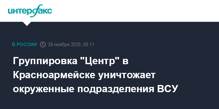 Москва. 29 ноября. INTERFAX.RU - Военнослужащие группировки "Центр" в течение суток уничтожали окруженные подразделения армии Украины в Красноармейске (Покровске), вели зачистку села Ровное, сообщил пресс-центр группировки в субботу.