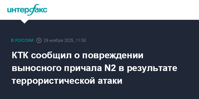 Москва. 29 ноября. INTERFAX.RU - Выносное причальное устройство N2 (ВПУ-2) Каспийского трубопроводного консорциума (КТК) в субботу получило значительные повреждения в результате целенаправленной террористической атаки безэкипажными катерами (БЭК), сообщает консорциум.