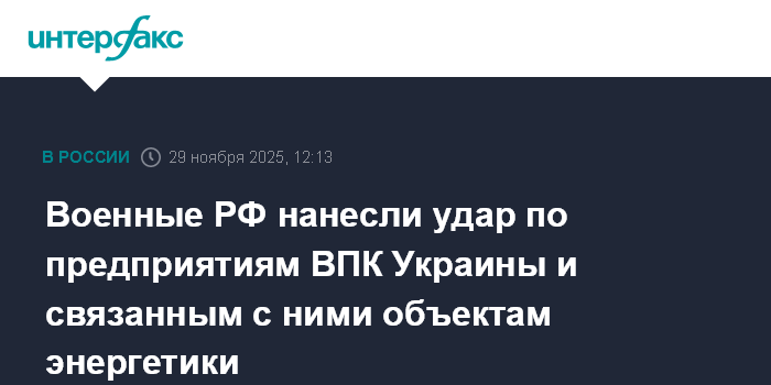 Москва. 29 ноября. INTERFAX.RU - Вооруженные силы России ночью нанесли массированный удар высокоточным оружием по предприятиям ВПК Украины и объектам энергетики, обеспечивающим их работу, сообщает Минобороны РФ.