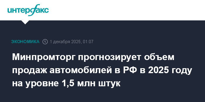 Минпромторг прогнозирует объем продаж автомобилей в РФ в 2025 году на уровне 1,5 млн штук