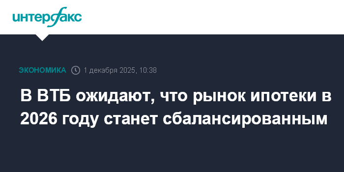 В ВТБ ожидают, что рынок ипотеки в 2026 году станет сбалансированным