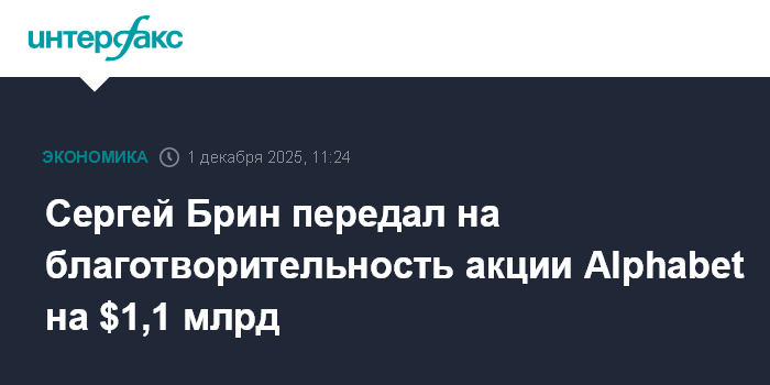 Москва. 1 декабря. INTERFAX.RU - Один из основателей Google Сергей Брин передал на благотворительность акции Alphabet Inc. на сумму свыше $1,1 млрд.
