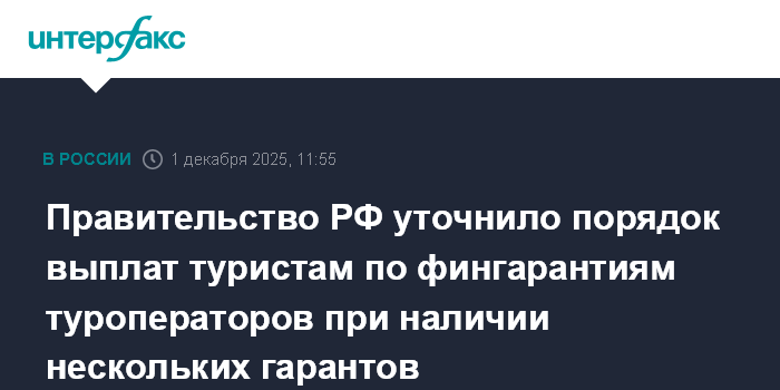 Москва. 1 декабря. INTERFAX.RU - Правительство РФ уточнило постановлением №1935 от 28 ноября 2025 г. порядок выплат туристам по фингарантиям туроператоров при наличии нескольких гарантов, документ опубликован на портале государственной правовой информации.