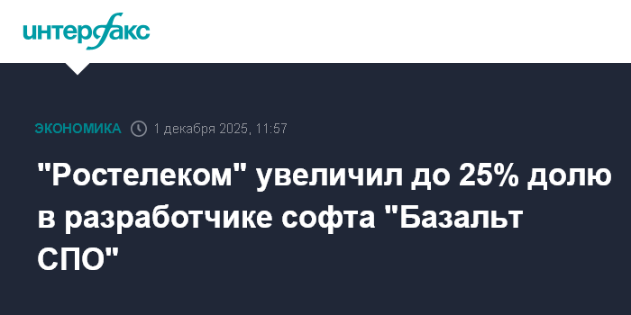 Москва. 1 декабря. INTERFAX.RU - Фонд поддержки национальных ИТ-решений "Консоль" (входит в ПАО "Ростелеком") нарастил долю в ООО "Базальт СПО" (разработчик системного ПО на базе ядра Linux) до 25% с 14,5%.