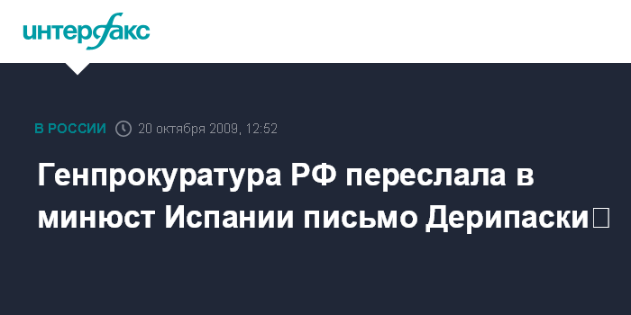 Москва. 20 октября. INTERFAX.RU - Генеральная прокуратура России переправила в Испанию обращение предпринимателя Олега Дерипаски, в котором он заявил о нарушении его прав испанскими правоохранительными органами. "В Генеральную прокуратуру России 9 сентября 2009 г. поступило обращение Олега Дерипаски, в котором он сообщает о нарушении его прав в ходе расследования компетентными органами Испании уголовного дела в отношении Михаила Черного и других лиц, отрицает свою причастность к каким-либо преступным организациям, совершение им преступлений", - сообщила "Интерфаксу" во вторник официальный представитель Генпрокуратуры РФ Марина Гриднева. Она отметила, что "поскольку в обращении Дерипаски ставятся вопросы, относящиеся к юрисдикции компетентных органов Испании, 15 сентября 2009 г. обращение направлено в министерство юстиции Испании для рассмотрения по существу".