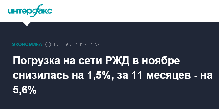 Москва. 1 декабря. INTERFAX.RU - Погрузка на сети ОАО "Российские железные дороги" в ноябре 2025 г., согласно оперативной информации, составила 94,2 млн тонн, что на 1,5% меньше, чем за аналогичный период прошлого года, сообщила компания