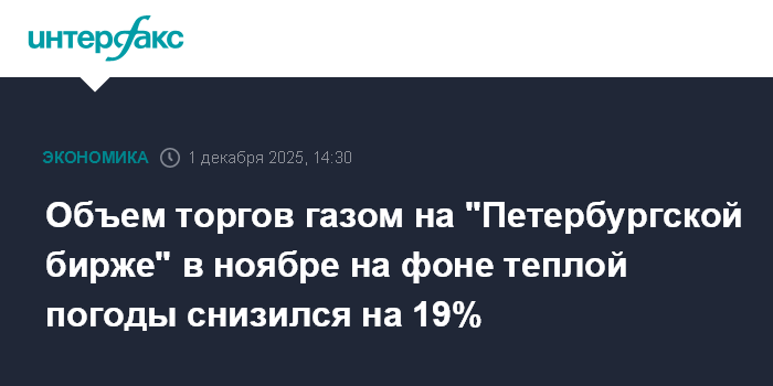 Москва. 1 декабря. INTERFAX.RU - Объем торгов газом на "Санкт-Петербургской международной товарно-сырьевой бирже" в ноябре 2025 года составил 1,341 млрд кубометров, что на 19% меньше, чем годом ранее (1,653 млрд куб. м), свидетельствуют данные площадки.