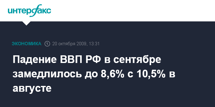 Москва. 20 октября. INTERFAX.RU - ВВП РФ в сентябре 2009 г. упал на 8,6% по сравнению с соответствующим периодом прошлого года. Такую предварительную оценку распространило во вторник Минэкономразвития РФ. Падение ВВП замедлилось по сравнению с августом, когда оно составило 10,5%. Замедление связано как с более низкой базой (в прошлом году падение ВВП ускорилось в сентябре), так и с восстановлением помесячного роста в 2009 г., отмечает Минэкономразвития.