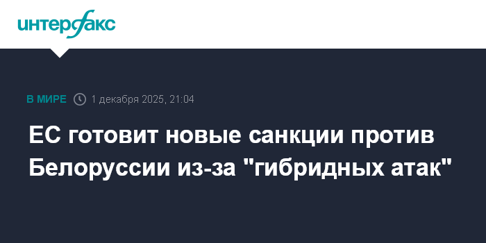 Москва. 1 декабря. INTERFAX.RU - Евросоюз ведет подготовку дополнительных ограничительных мер против Белоруссии в связи с "гибридными атаками", заявила в понедельник председатель Еврокомиссии Урсула фон дер Ляйен.