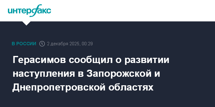 Москва. 2 декабря. INTERFAX.RU - Начальник Генштаба ВС РФ Валерий Герасимов заявил, что российские военные наступают с высоким темпом в Днепропетровской и Запорожской областях.