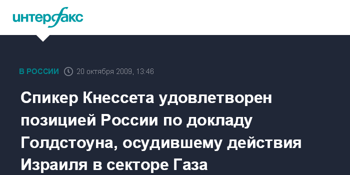 Москва. 20 октября. INTERFAX.RU - Спикер Кнессета Реувен Ривлин в ходе встречи с президентом Всемирного конгресса русскоязычного еврейства Борисом Шпигелем выразил удовлетворение в связи с позицией России относительно доклада комиссии Голдстоуна, посвященного войне в секторе Газа.