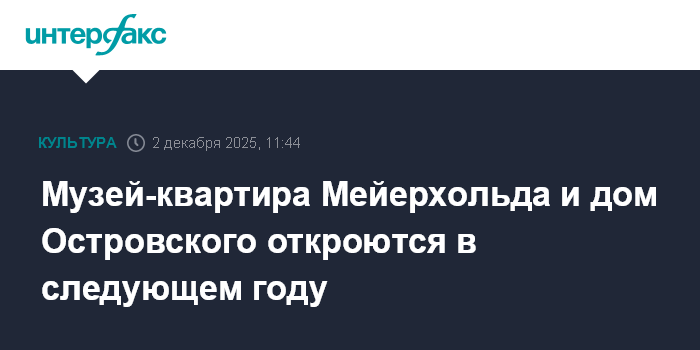 Москва. 2 декабря. INTERFAX.RU - Музей-квартира Мейерхольда в Брюсовом переулке и мемориальный музей Островского на Большой Ордынке откроются в следующем году, сообщила министр культуры РФ Ольга Любимова в своем канале в мессенджере Max.