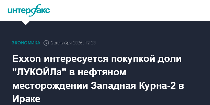 Москва. 2 декабря. INTERFAX.RU - Американская ExxonMobil обратилась к министерству нефти Ирака с заинтересованностью в покупке доли российского "ЛУКОЙЛа" в гигантском нефтяном месторождении Западная Курна-2, пишет агентство Reuters со ссылкой на пять иракских официальных источников.