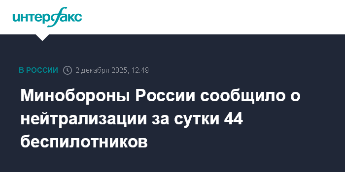 Москва. 2 декабря. INTERFAX.RU - Средства ПВО Вооруженных сил России за сутки сбили 44 украинских беспилотных летательных аппарата самолетного типа.