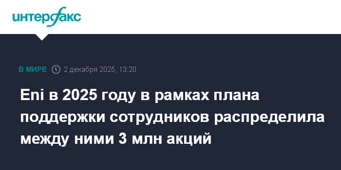 Москва. 2 декабря. INTERFAX.RU - Итальянская нефтегазовая Eni в 2025 году по Программе участия сотрудников в акционерном капитале (Employee stock ownership plan, ESOP) распределила свыше 3 млн акций среди более 26 тыс. сотрудников.