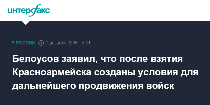 Москва. 2 декабря. INTERFAX.RU - Министр обороны РФ Андрей Белоусов заявил, что Красноармейск (Покровск) в ДНР имеет стратегическое значение, переход города под российский контроль создал условия для дальнейшего продвижения войск.