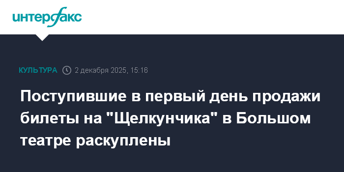 Москва. 2 декабря. INTERFAX.RU - Билеты на первые показы балета "Щелкунчик" Большого театра, поступившие в продажу сегодня, раскуплены за несколько часов со старта продаж, следует из информации, представленной на сайте театра.
