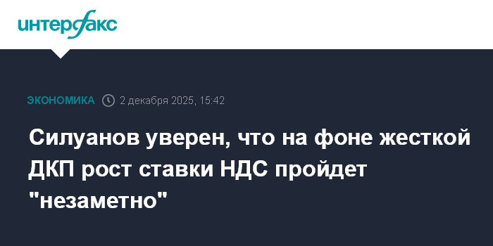 Москва. 2 декабря. INTERFAX.RU - Повышение ставки НДС в условиях жесткой денежно-кредитной политики (ДКП) может пройти фактически "незаметно", считает министр финансов РФ Антон Силуанов.