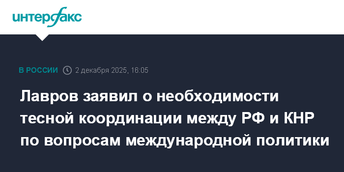 Москва. 2 декабря. INTERFAX.RU - Мировая динамика требует тесной координации между Россией и Китаем по вопросам международной политики, заявил глава МИД РФ Сергей Лавров.